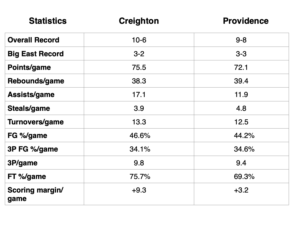 Can the Friars continue this offensive explosion against the run-and-gun Creighton Bluejays, who average 75.4 pts/game and feature all Big East player 7’1” senior Ryan Kalkbrenner? Two weeks ago, after the embarrassing loss to Marquette, I would have circled this away game versus Creighton as a probable loss. Let’s take a look at the Creighton season numbers compared to the Friars.