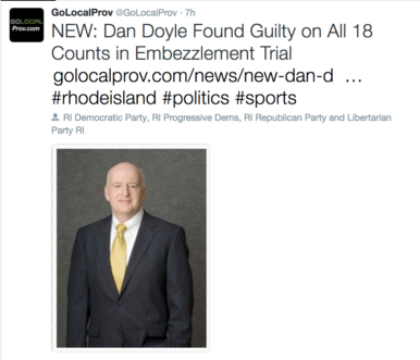Attorney General Peter F. Kilmartin announced that Daniel Doyle (age 67), of West Hartford, CT, was found guilty on December 5 by a Washington County Superior Court jury on all 18 counts charged in the Institute for International Sport embezzlement case. Doyle was found guilty of seven counts of embezzlement, one count of obtaining money under false pretenses, five counts of forgery, and five counts of filing a false document.