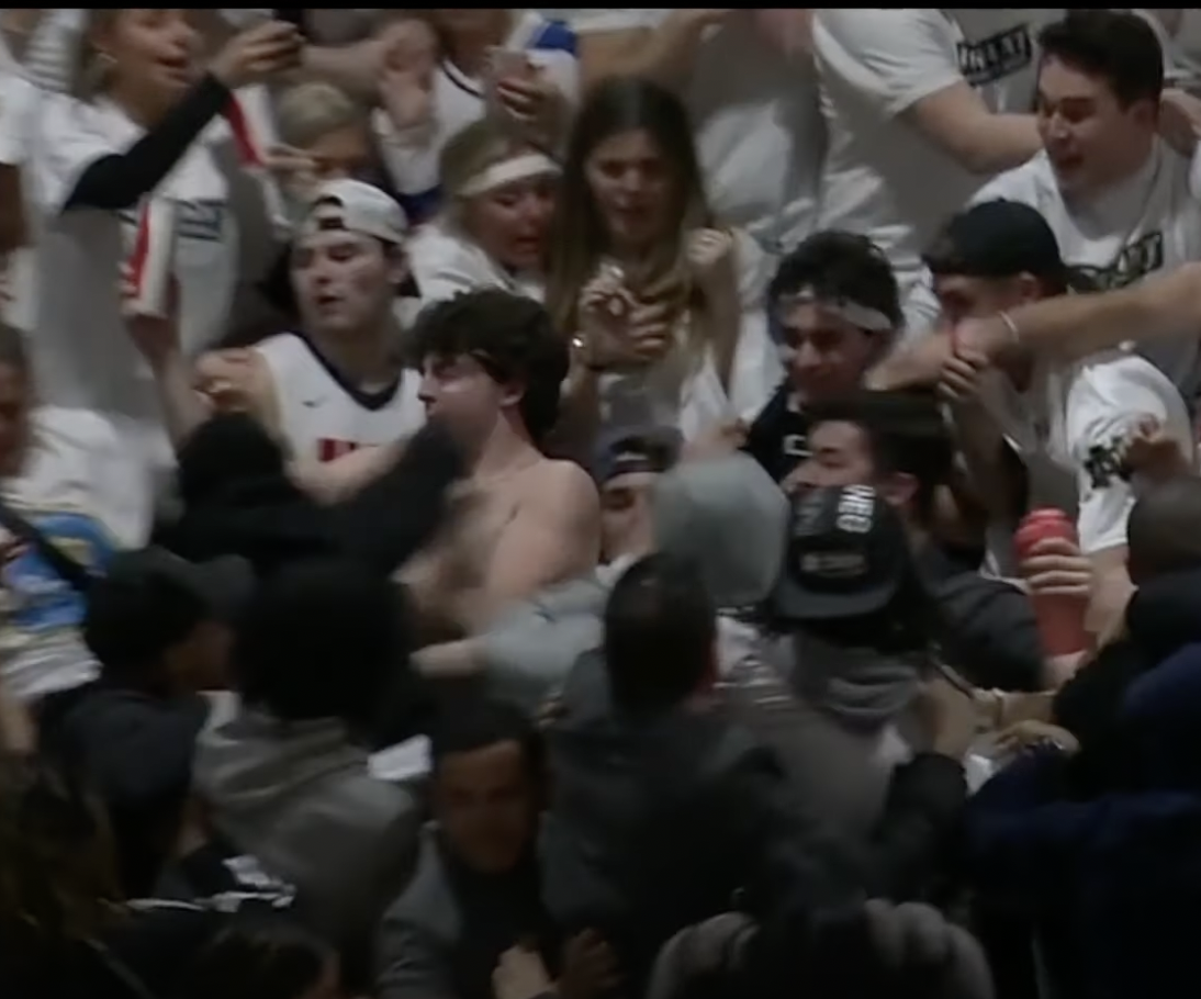 Bryant won 70 to 43, but the victory was overshadowed by a brawl in the stands late in the second half.