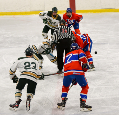 The Mount Saint Charles Mounties edged the Bishop Hendricken Hawks 5-4 at Thayer Arena in Warwick.