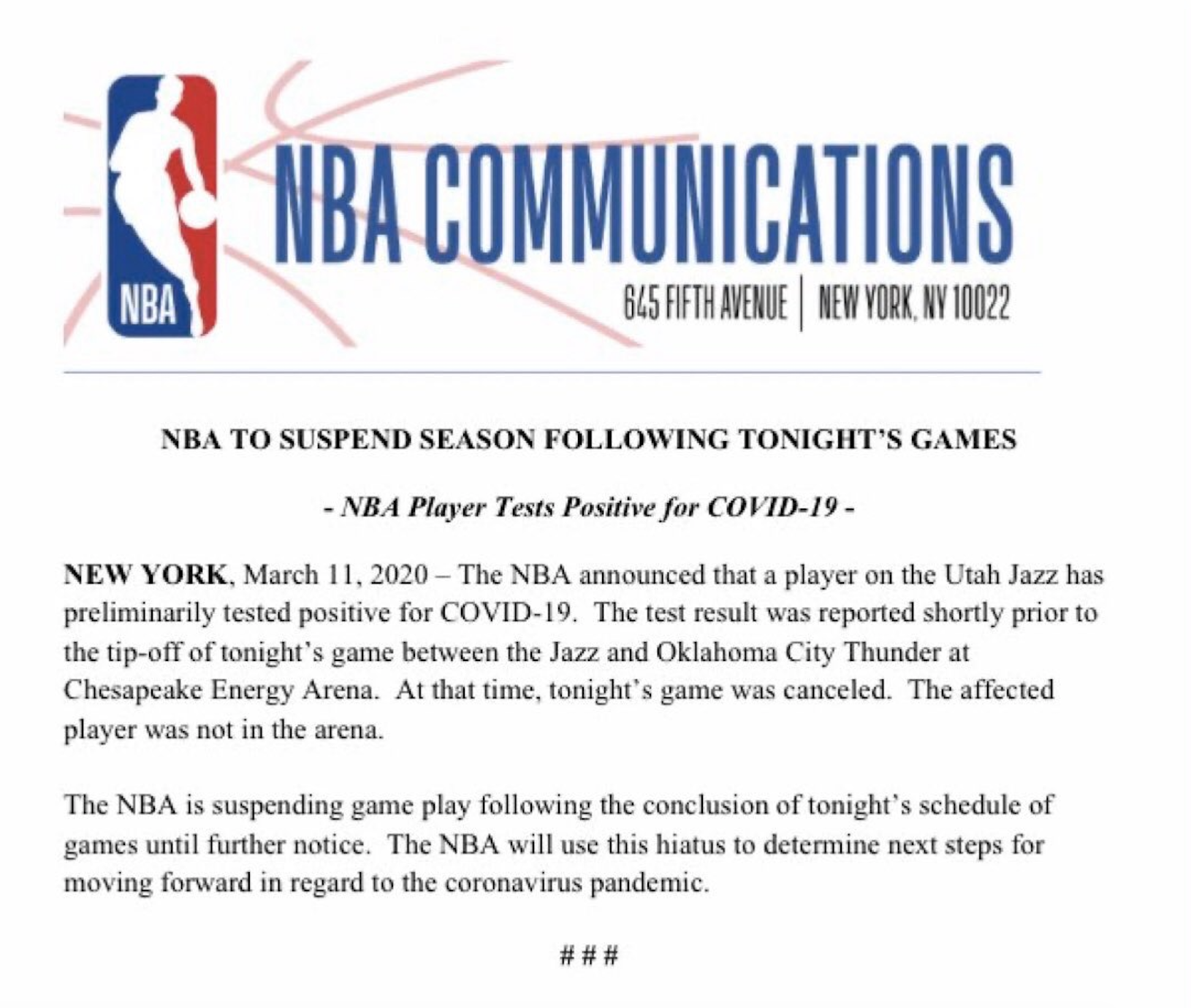 The NBA is suspending all games following the conclusion of tonight’s schedule of games until further notice.