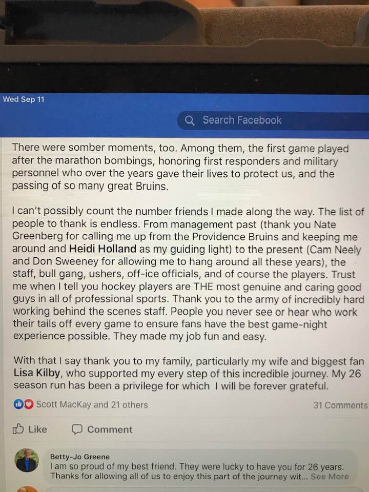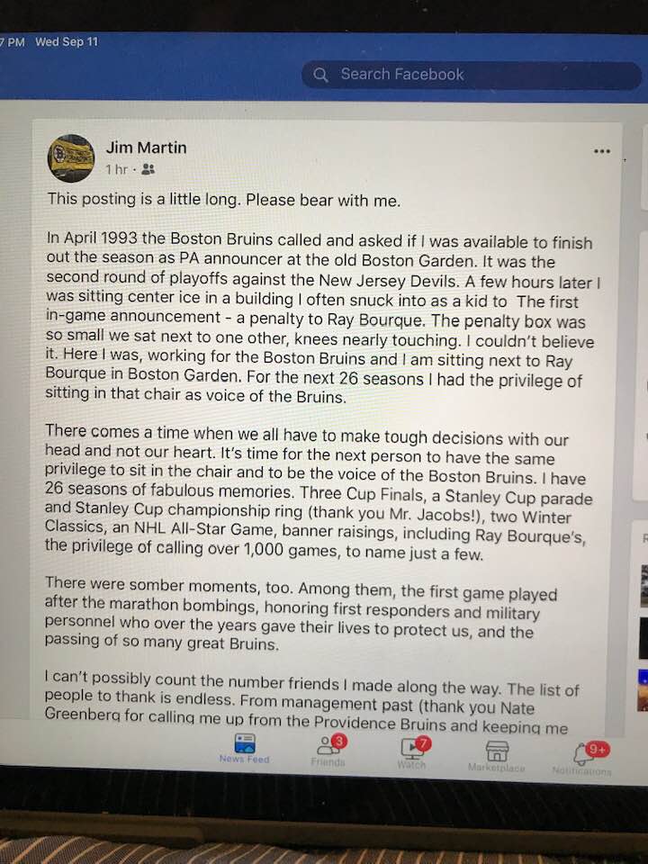 “There comes a time when we all have to make tough decisions with our head and not our heart. It’s time for the next person to have the same privilege to sit in the chair and to be the voice of the Boston Bruins,” wrote Martin.