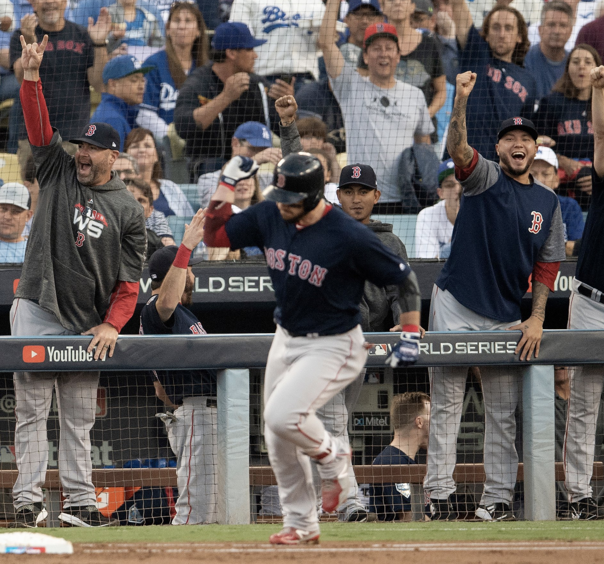 The Red Sox jumped out to a lead in the first inning when Pearce belted a two-run home run off of Dodgers pitcher Clayton Kershaw to put Boston up 2-0.