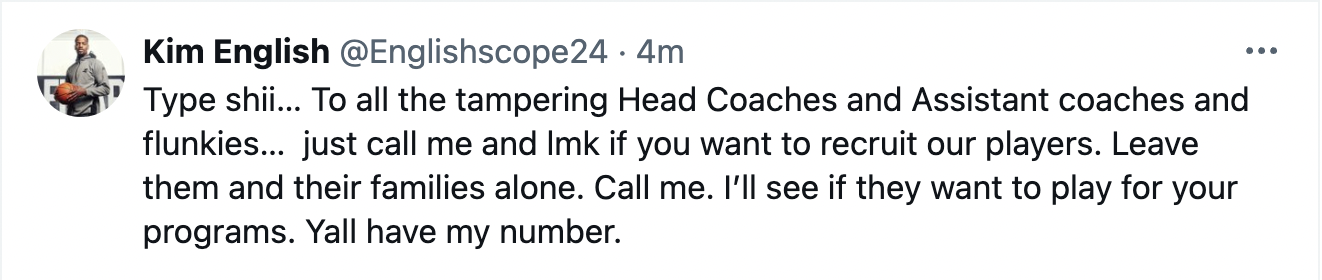 On Tuesday, English posted,”Type shii… To all the tampering Head Coaches and Assistant coaches and flunkies… just call me and lmk if you want to recruit our players.