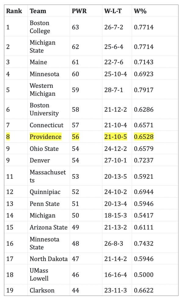 As of March 17th, Providence College has a pairwise ranking of 8th in the country. That ranking, even with other games still being played by other teams, is likely not to fall significantly by March 23rd. One of the factors helping PC is the overall strength of the Hockey East league. Hockey East is the strongest league in college play this year. Its record against teams from other leagues is mind-blowing 75-29-3 for a winning percentage of .715. Providence, for example, was 9-1 this year against non-conference teams, the only loss coming in the opening game of the year on the road at North Dakota.