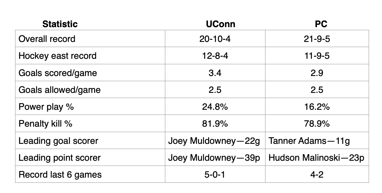 UConn has scored 114 goals this year to PC’s 101 goals. UConn is led by sophomore Joey Muldowney who is the 7th leading goal scorer in Hockey East this year.