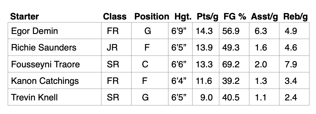 - They have an unusual lineup, featuring a 6’6” center in senior Fousseyni Traore and a 6’9” point guard in freshman phenom Egor Demin (a 5-star recruit from Russia of all places). I wonder who Coach English will have guarding Demin.