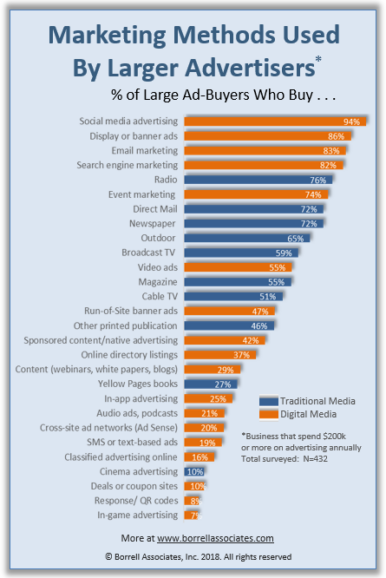 According to media consultant Gordon Borrell, "Social media tops the list of marketing methods for big local advertisers. But when you average out what they're spending, this list is almost reversed. They average $29,561 on social media, and four to almost 10x that amount on newspapers, radio, & TV advertising."