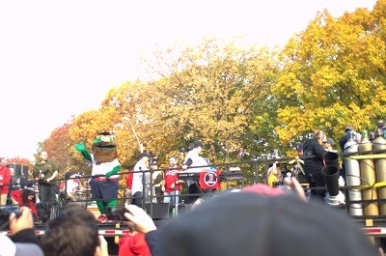 The last boat in line fires more confetti into the crowd. One of the colonial era Boston natives somehow managed to make an appearance (see left)