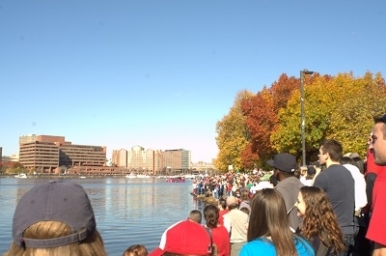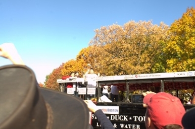 Fans waited all along the Longfellow Bridge for the duck boats to come down the Charles River.