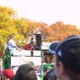 Pedroia tosses a souvenir to a lucky fan in the crowd.