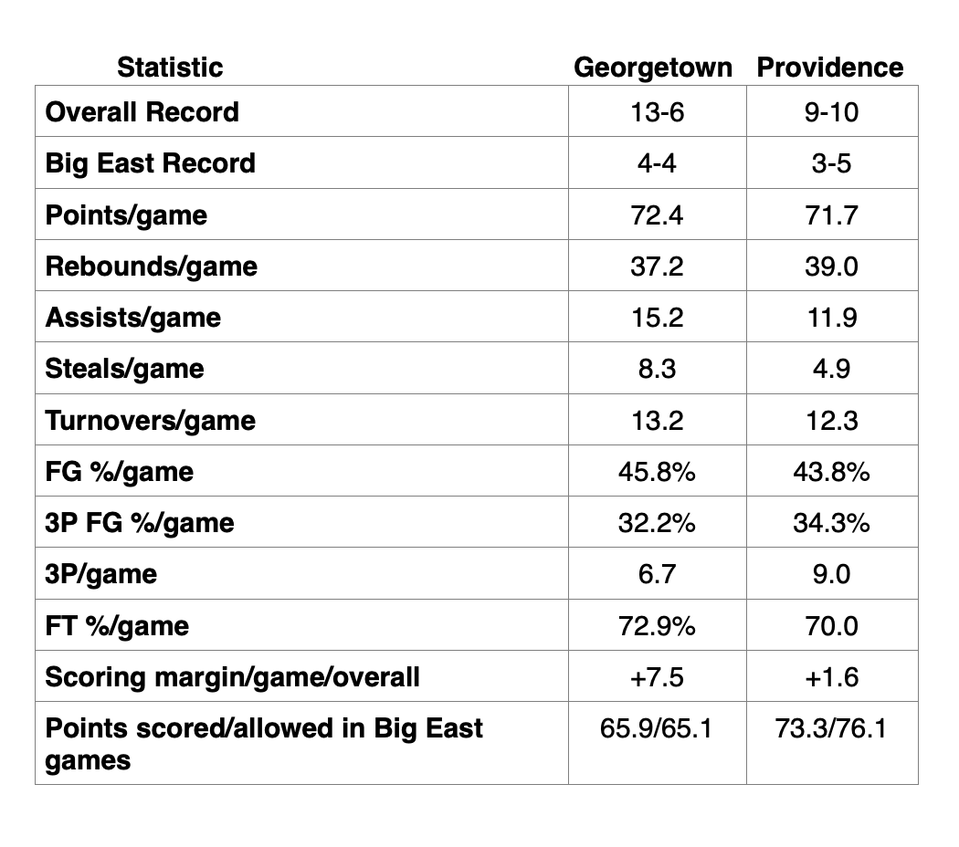Georgetown is winning more games than PC because of slightly better numbers in field goal and free throw percentage, and because of more steals.