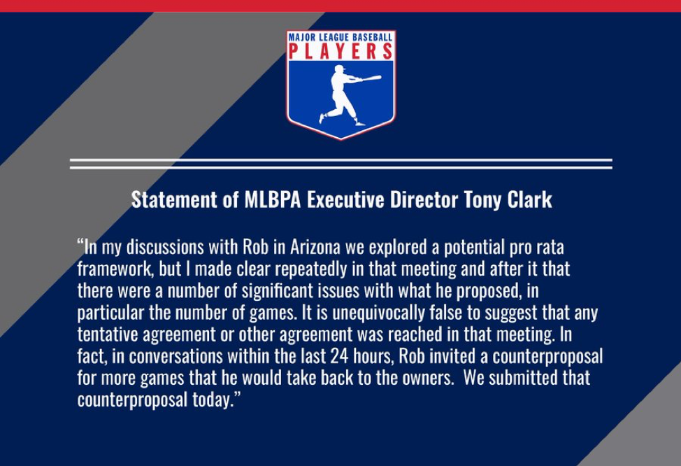 Oh sure, we know there are still things to be worked out officially as to how many games are to played, who gets paid what and when it will start, but I think we can all agree that come August, there will be baseball being played in some form or fashion. My guess is anywhere between 48 -60 games. And yes, we still think that even after the two sides can’t even agree on what they’ve agreed on prompting Players Association President Tony Clark to issue this tweet Thursday.