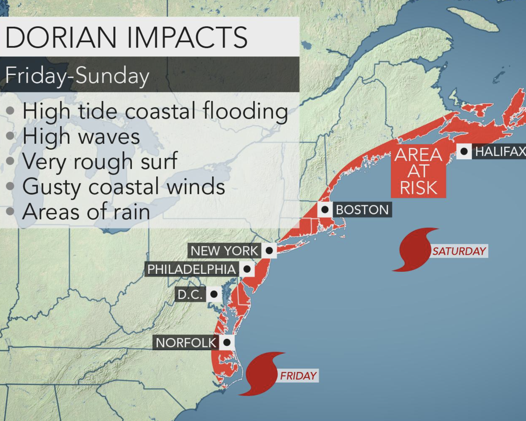 GET THE LATEST BREAKING NEWS HERE -- SIGN UP FOR GOLOCAL FREE DAILY EBLAST“Dorian is forecast to swing well east of the mid-Atlantic coast on Friday. The overall size of the hurricane will grow and spread northward as the peak winds near the center diminish. This means that Dorian will have some impact from rain, wind and rough seas in the northeastern United States, even though the storm is likely to remain at sea,” writes AccuWeather.